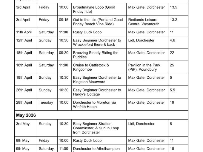 Easy Beginner Dorchester to Wr... Sunday 12th April 2026 10:30am DT1 1XU 0 stars Full details
