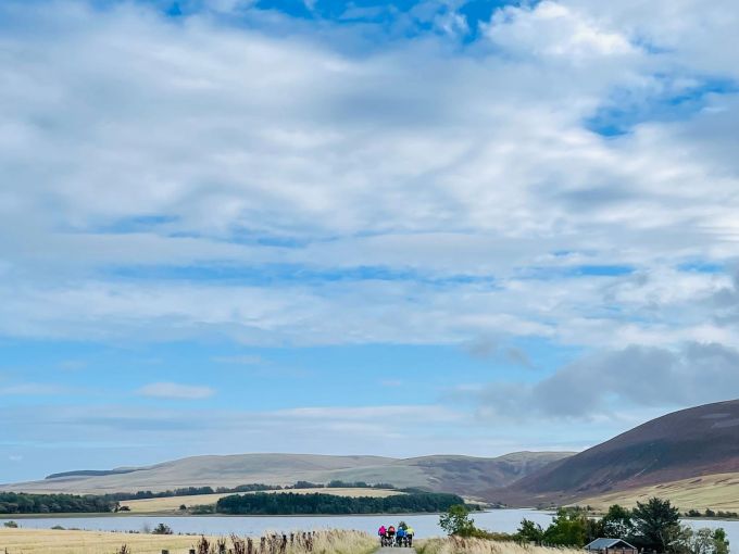 Mostly tracks and very quiet roads. Bit of gravel path by the reservoirs so not suitable of very skinny tyres. There is a very short section just before Clubbiedean Reservoir which is quite stoney and rough but we can have a wee walk.
