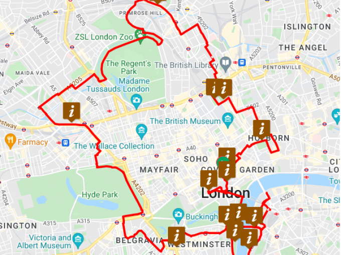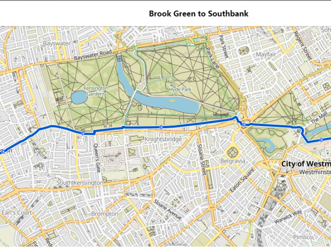 We will be riding on the road via Kensington High Street and use the cycle lanes at Hyde Park Constitution Hill, Westminster Bridge and turn left at Belvedere Road to reach the National Theatre.