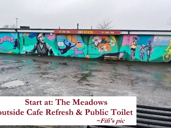 Starting from - The Meadows: its east end - outside the Public Toilet and Cafe Refresh (See Photo; Google Map location: https://maps.app.goo.gl/AQUgGD5dp3zh4CQXA ), EH8 9NQ