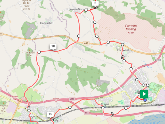 Meet at the Choir Hall at 10:30am, ride through Caerwent and take the road to Llanfair Discoed turning off for the pretty Cwm valley which is a dead-end. From there to Magor via St Brides before returning to Caldicot via Undy and Rogiet.