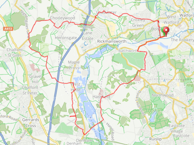 From Watford out through Chorleywood and Chalfont St Peter for refreshments at Denham Aerodrome and return via Harefield. 1100 feet of climb. All on road or tarmac cycleway. Suitable for any bike.